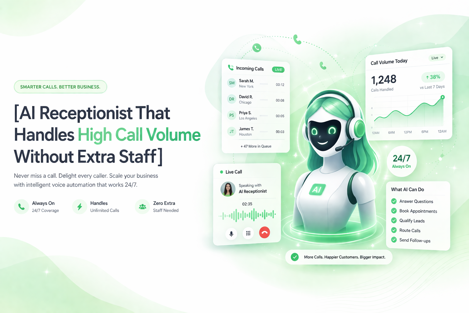 • Scalable Call Handling and Routing: AI Caller Call AI and AI Call Assist enable efficient management of all AI Phone Call Assistant operations throughout busy call periods.